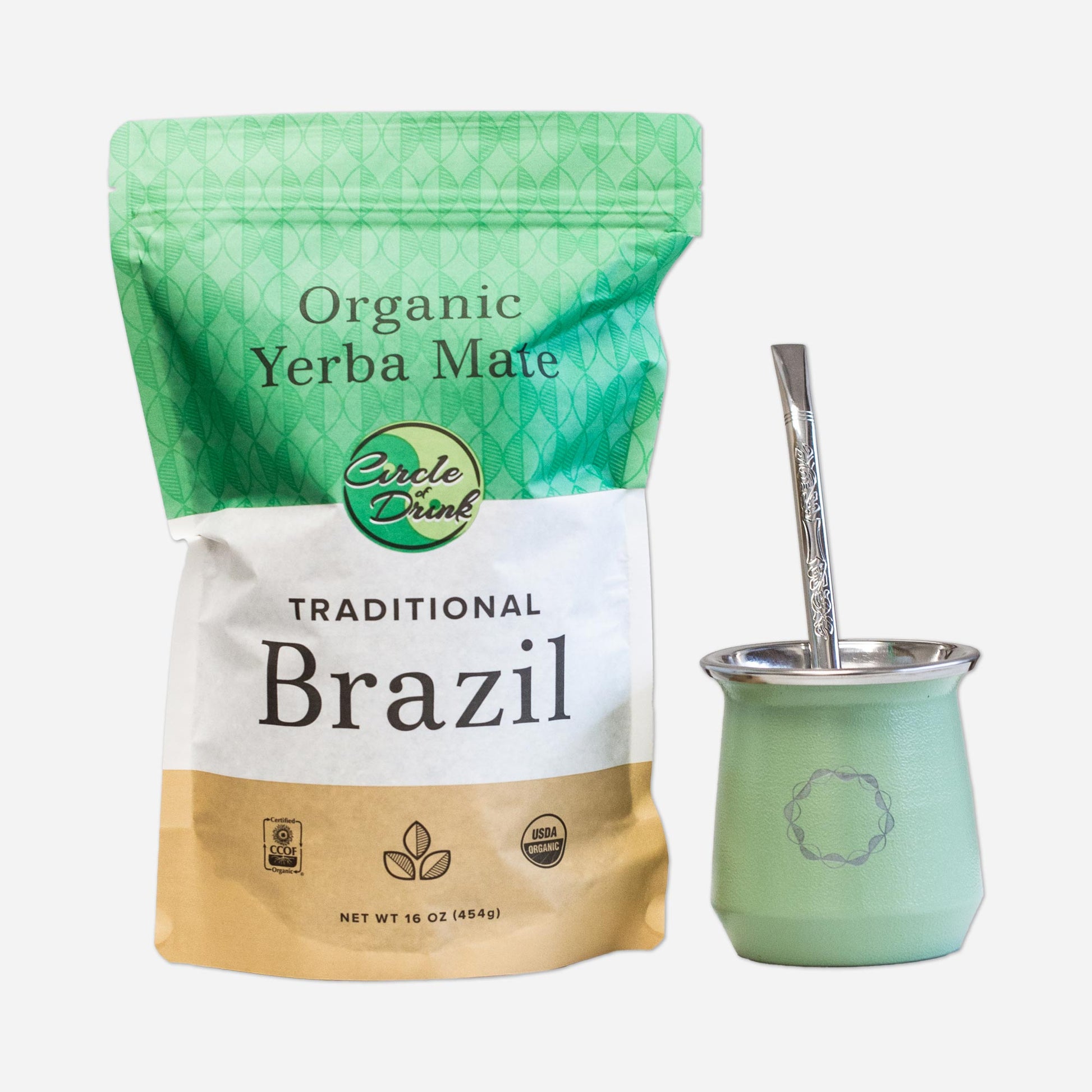 Enjoy this mate kit with a Ryo Stainless spoon bombilla and one pound of Brazil Traditional Organic Yerba Mate.